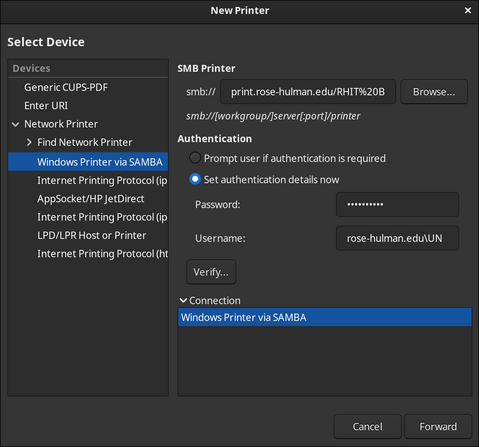 Select Set authentication details now and add your Rose-Hulman password and set the username as rose-hulman.edu\[your user name]